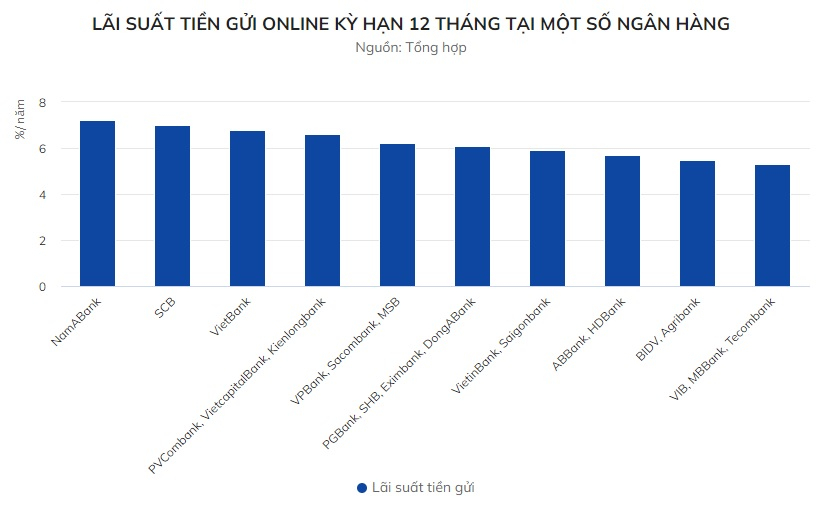 Hiện lãi suất tiền gửi trực tuyến kỳ hạn 1 năm cao nhất là 7,2 % / năm do NamABank vận dụng, cao hơn 1 điểm % so với mức gửi tại quầy ở chính ngân hàng này .